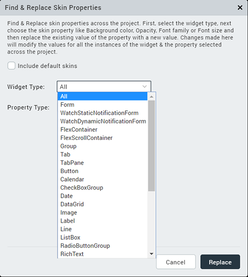 - For the Calendar widget, skin properties for the Grid and Cell cannot be changed using the Find and Replace option.