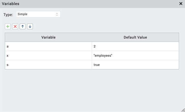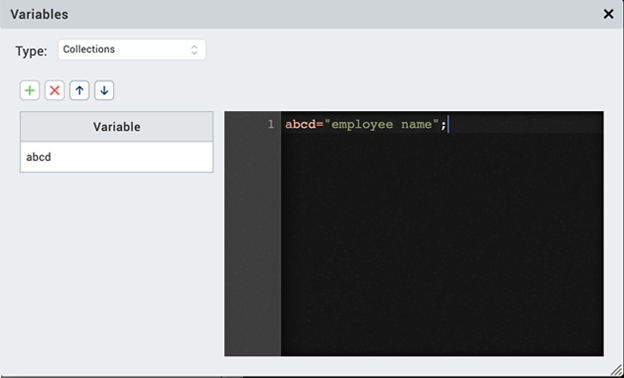 - To add a new row for another variable, click the + icon. To delete an added variable, select the row and click the red X icon. If you want to modify the order of the variables, click the upper and lower arrow icons as required.