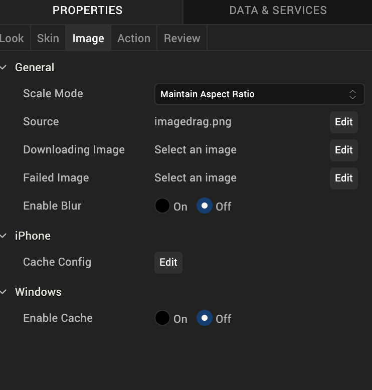 Image properties specify properties that are available on any platform supported by Volt MX Iris, and assign platform-specific properties.
