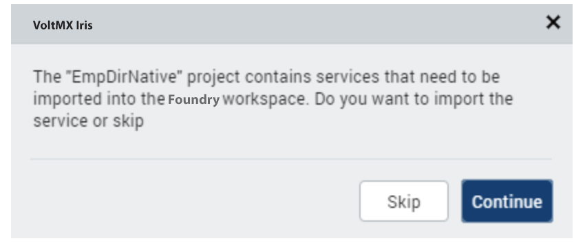 If the project contains Volt MX Foundry Services associated with the app, Volt MX Iris displays a dialog box, prompting if you want to import the Services as part of the project import. Click Continue to import the Volt MX Foundry Services associated with the app. Click Skip to import the project without importing the Volt MX Foundry Services associated with the app.