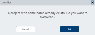 If a project with the same name exists already, the Conflict dialog box appears, prompting you if you want to overwrite the existing project. Click OK to overwrite the existing project. Click Cancel to end the import process.