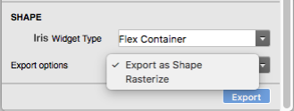 - Export as Shape. The Shape layers are exported as the widget type selected in the Iris Widget Type drop-down list, and the layer styles are converted to the equivalent styles supported under VoltMX Iris skin properties. This option is not available if the Iris Widget Type you select is Image.