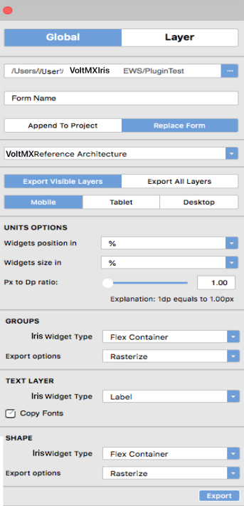 Using the VoltMX Iris plugin for Sketch , you export your Sketch project as a VoltMX Iris Project that you can then open in VoltMX Iris. In preparing a project for export, you set the global, default export options, set the export options you want for individual layers (overriding the global settings for that particular layer), and indicate the channel you want the project to be exported for.