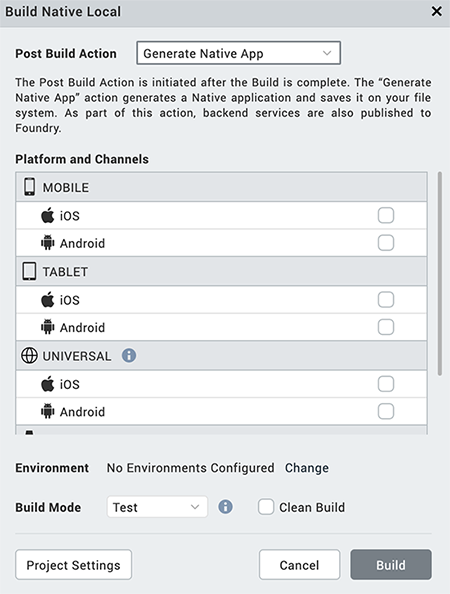 You can generate native apps even for the Universal channel by selecting a platform from the Universal section. This generates the APK or IPA for each of the platforms and channels selected.