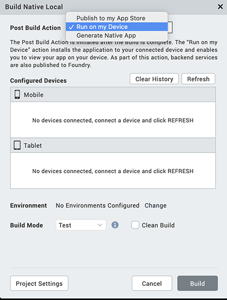 - Run on my Device – This action installs the application to your connected device and enables you to view your app on your device