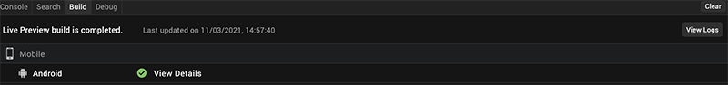 - If you app uses NFIs, the build generation begins. You can check the status of your build in the Build tab. If there are any errors, they appear in the Build tab. Switch to the Console tab to view a detailed log of the errors.