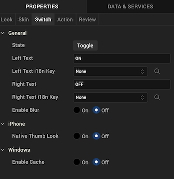 Switch properties specify properties that are available on any platform supported by Volt MX Iris, and assign platform-specific properties.
