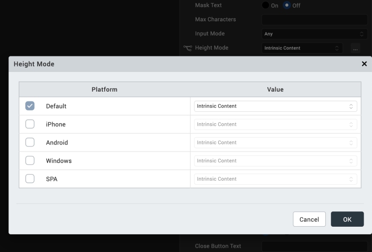 To provide a platform-specific or default value, click the Ellipsis button (...) to open the Height Mode dialog box, and then select a value.