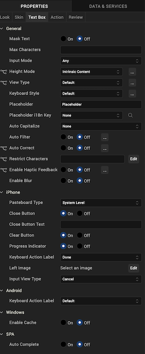 TextBox properties specify properties that are available on any platform supported by Volt MX Iris, and assign platform-specific properties.