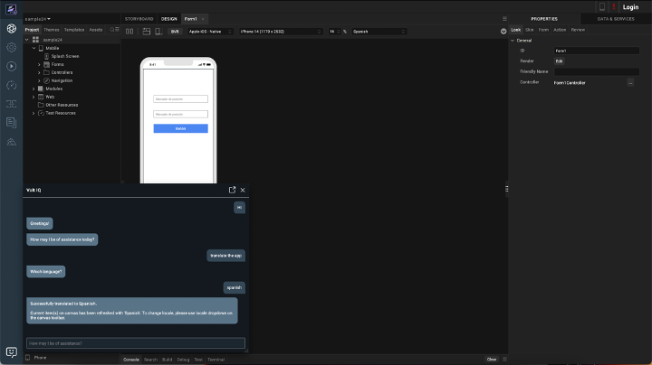 Volt IQ helps you translate an application into different languages by using the Google translate API. During translation, the text in an application is converted into equivalent i18n keys in the target language. The properties of widgets that are set through the Properties panel and through code are translated.