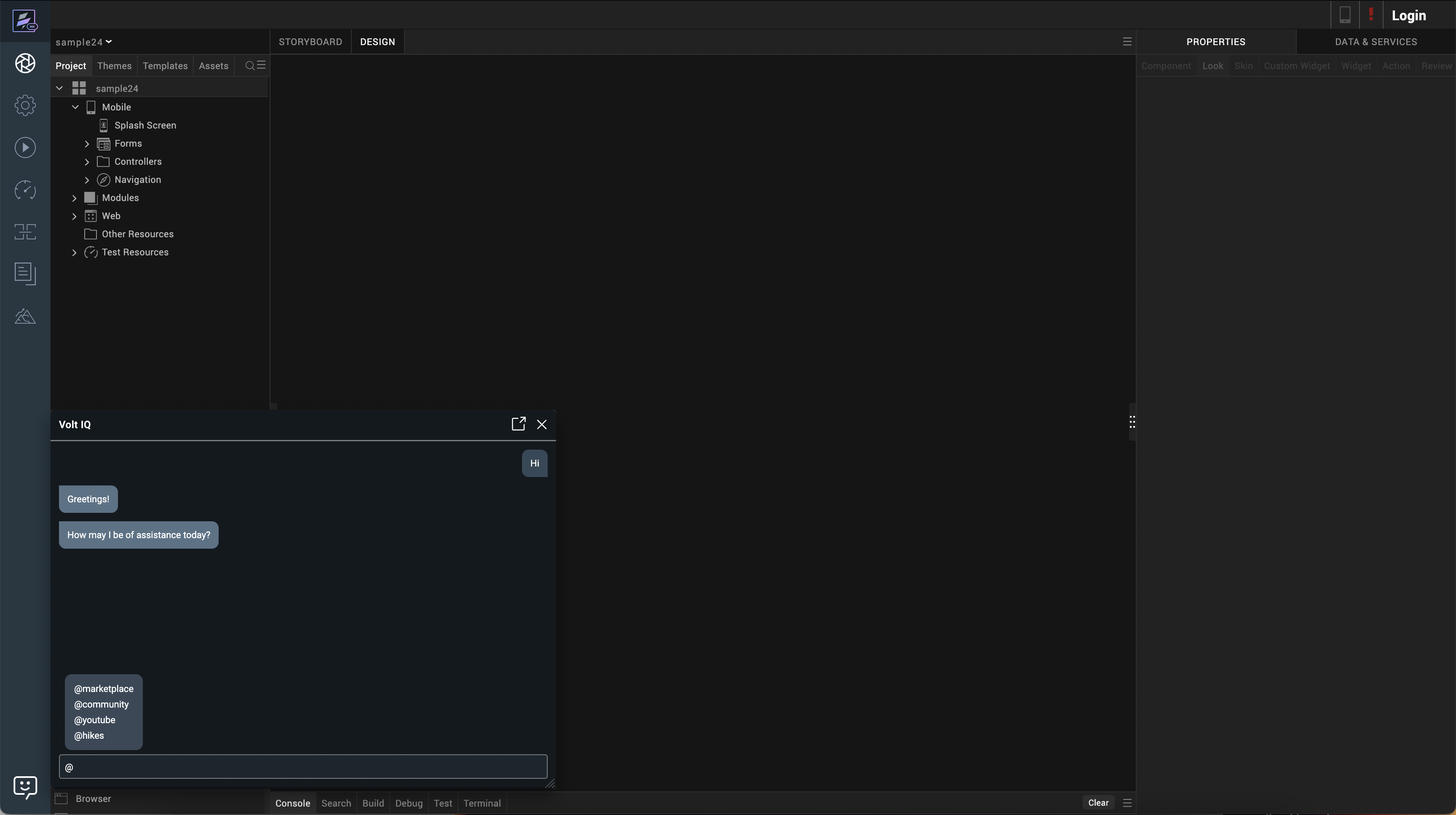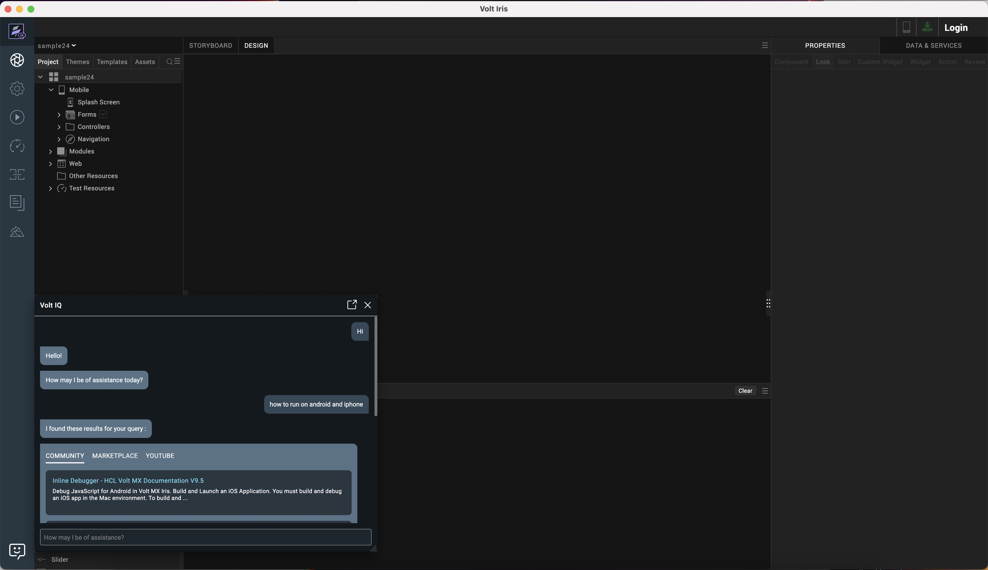 Volt IQ is a chatbot designed to help Volt Iris users through their journey to create applications for various channels on Volt MX AppPlatform. The chatbot can assist users in various ways: building a binary, importing projects, searching for help materials on Volt MX Community in a single query, and more.