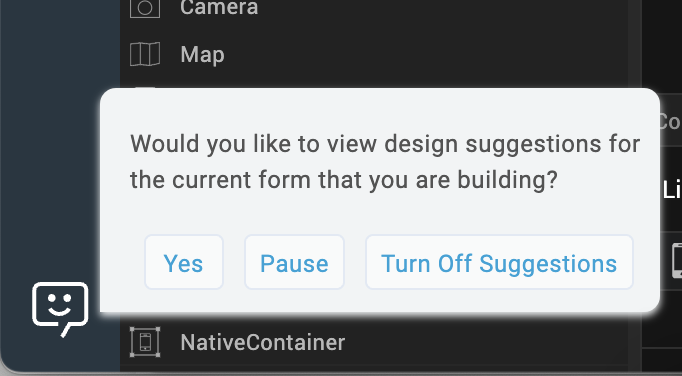 If you've paused or turned off design suggestions, you will see Enable Design Suggestions. Click Enable Design Suggestions to fetch the design suggestions for the current form.