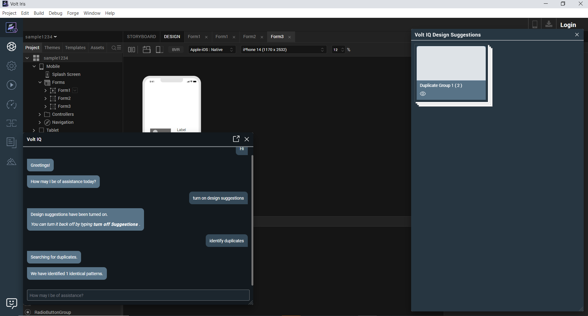 Furthermore, Volt IQ can detect duplicate designs in your project. To fetch the duplicates of a design, type a command, such as “identify duplicates”, in the Volt IQ chat window and press Enter. A list of duplicate design groups is displayed in the Volt IQ Design Suggestions window. You can then view each duplicate design and copy it to a form.