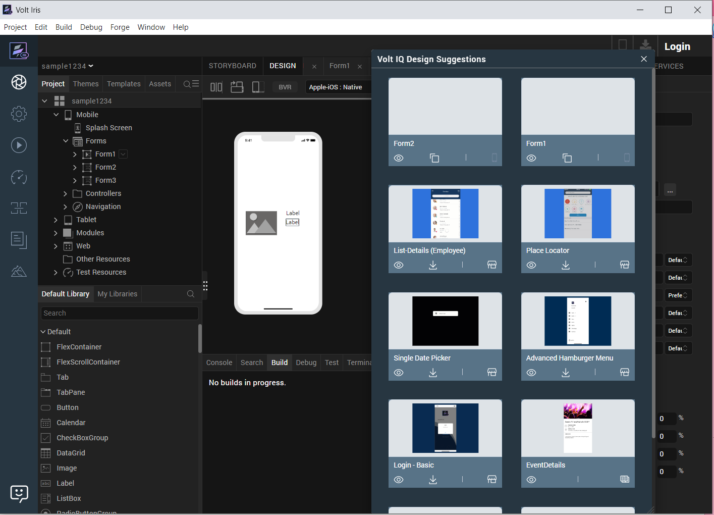 For instance, if you design a form with two TextBox widgets, and one Button widget, Volt IQ predicts that you could be creating a Login form and recommends designs such as the Login component from HCL Marketplace.