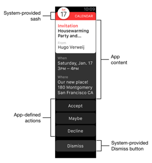 The long look notification form contains a sash that is provided by the system. Next is the app's notification content. Your app may define specific action buttons that send action messages back to the iOS app that is paired with your Apple Watch app. Finally, the system provides a Dismiss button.