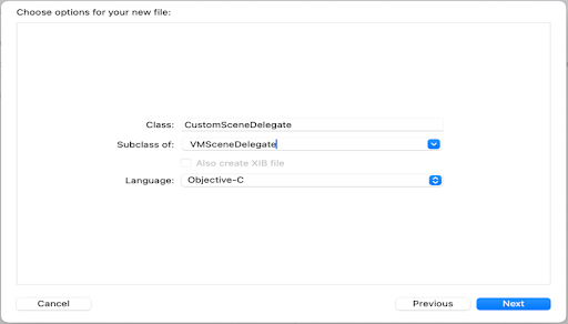 Ensure your custom class is a subclass of VMSceneDelegate and that you have selected Objective-C as the programming language. When Xcode creates your custom class, it generates a header file (.h) and an implementation file (.m), then adds them to your project.
