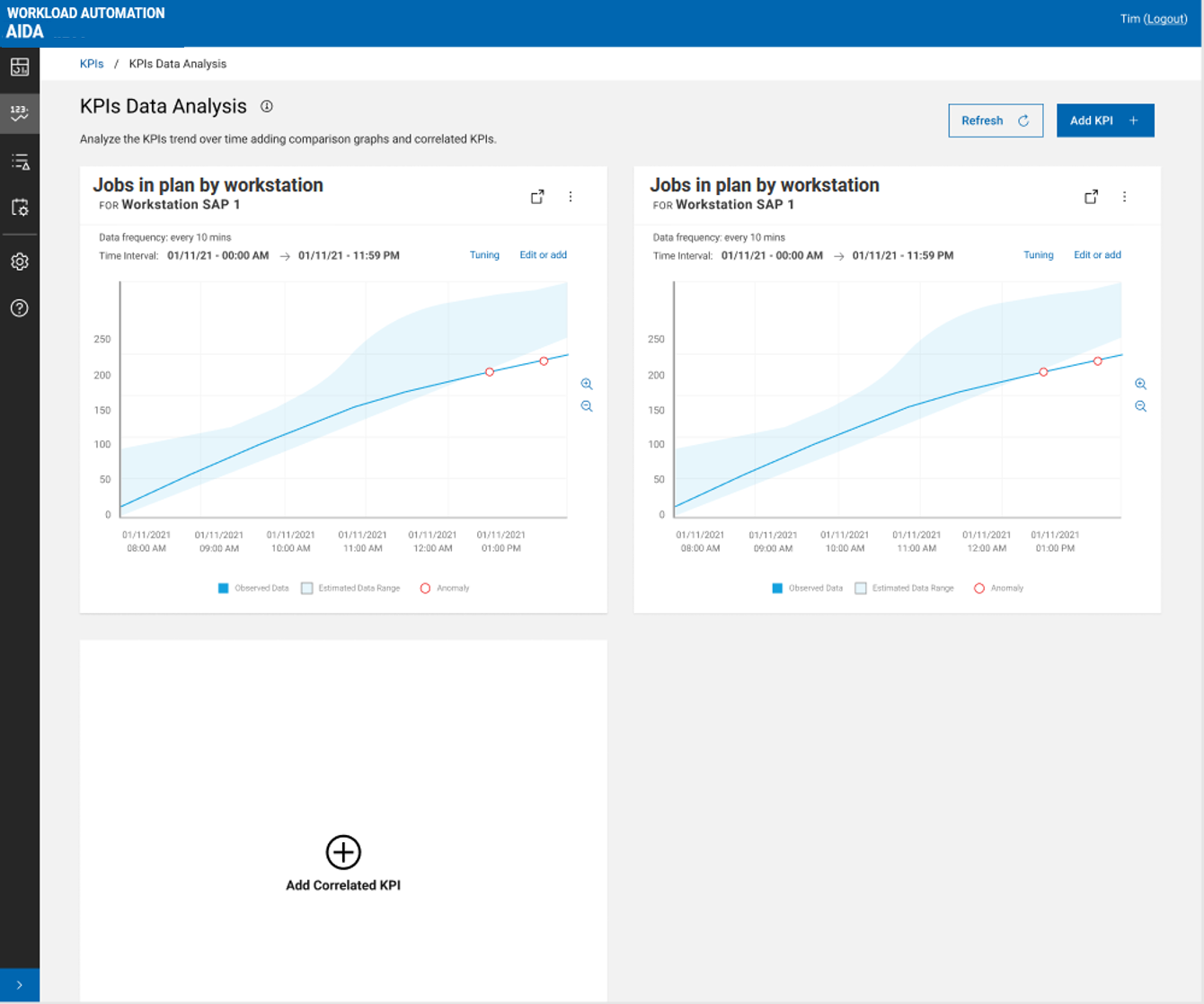- Tuning, to configure the KPI prediction parameters in the Tuning side panel. For example, you might run this action to increase or decrease the tolerance interval for anomaly detection. After tuning, a retrain is needed to immediately apply your changes. Refresh the graph to see the tuning result on the KPI prediction. Tuning is available to AIDA administrators only. For details, see Configuring AIDA for prediction.