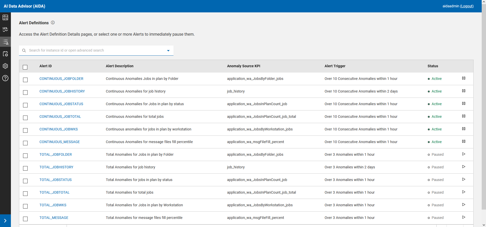 See all the alerts defined in AIDA. Pause one or more alerts immediately.