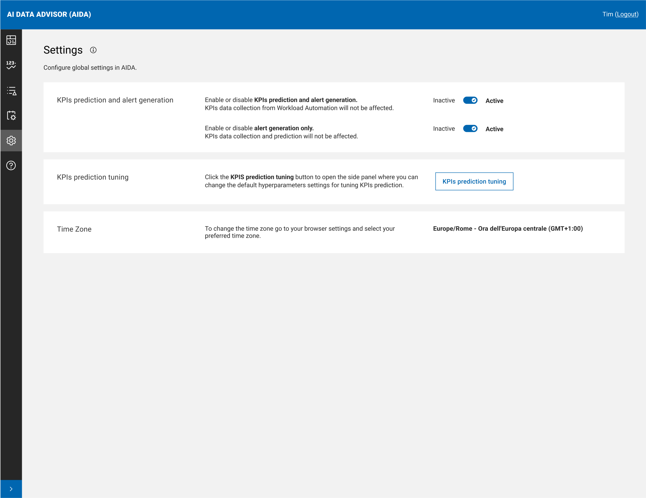 From AIDA left-hand sidebar, select Settings to configure AIDA global settings.