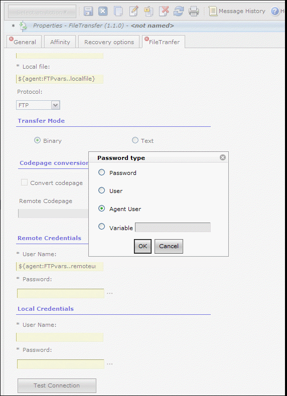 OKbutton for confirmation in the popup window, theRemote Credentials→Passwordfield is filled with the${agent:password.${agent:FTPvars..remoteuser}}value.