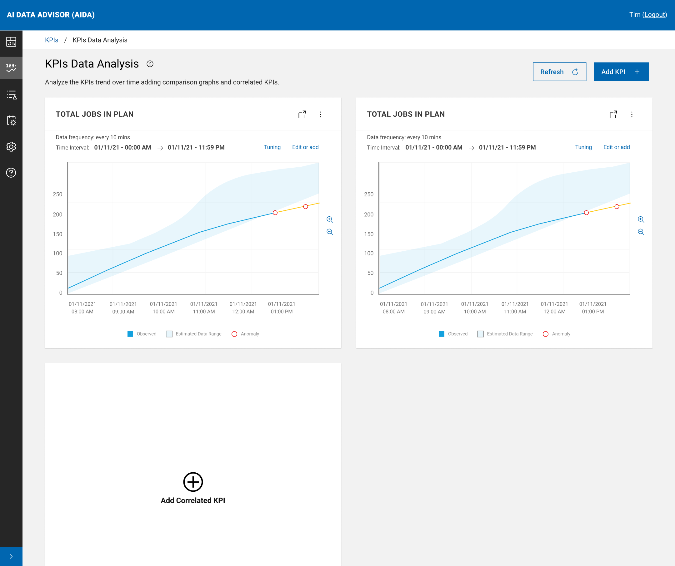 - Tuning, to tune a KPI prediction parameter, the anomaly detection sensitivity in the KPIs prediction tuning popover. This action allows you to increase or decrease sensibility, with higher sensibility identifying more anomalies. You can also modify all KPIs using the Global tuning button, which overrides individual KPI settings. These changes will be applied after the next retraining. Tuning is available to AIDA administrators only.