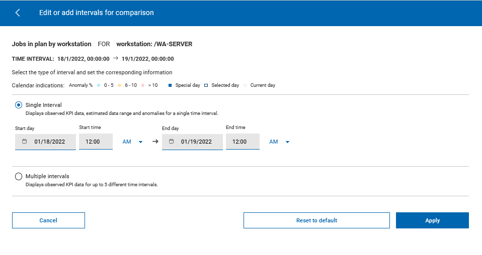 - Select Reset to default to return to the original time interval, or Close to close the Datepicker panel.