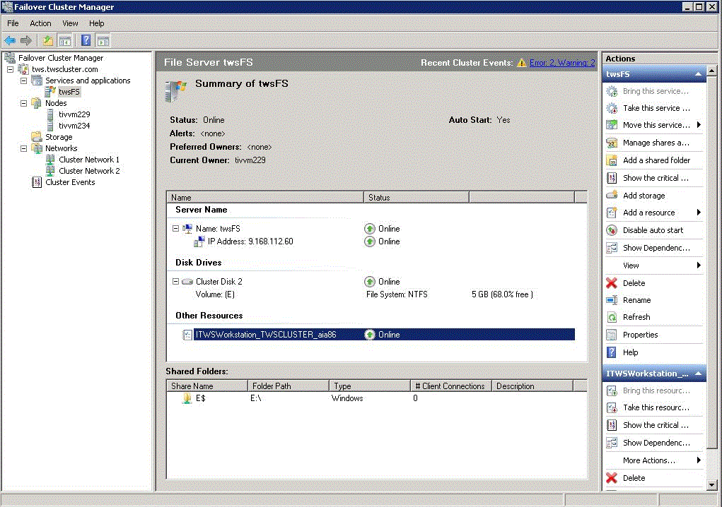 In the File Server example on Windows Server 2008 example, the ITWSWorkstation_CLUSTER_aia86 resource instance is saved in the twsFS File Server.
