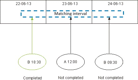 In situations were a possible match can be found also after the IA time of the successor, the scheduler first checks if there is a match with a completed predecessor before the IA time. If it finds it, it considers the dependency as resolved and does not add it in the plan. For example, operation A with a IA time at noon of 23-06-2013 is defined in the database with B as external predecessor. The match is to be looked for within an absolute interval spanning from 18:00 of the day before to 20:00 of the day after the IA time of A.