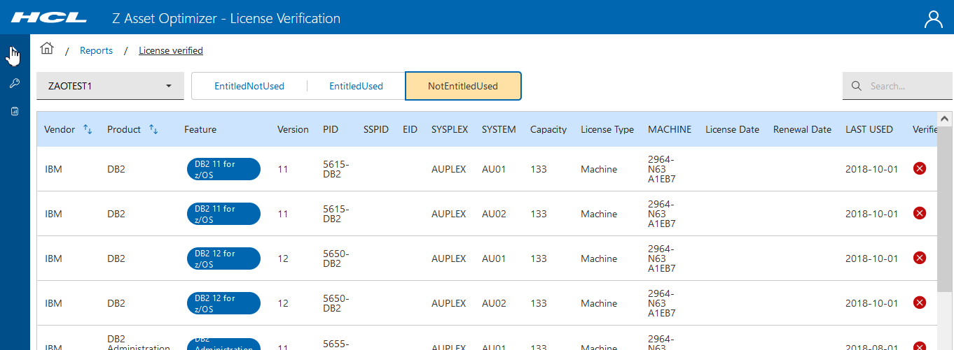 NotEntitledUsed is a report that shows you licensed products that are being used but that do not meet the verification criteria. Click on the red X button to see the reason why the product has not been verified. It is possible the capacity of the machine or LPAR has changed and does not match the license. It could also mean the renewal date has expired.