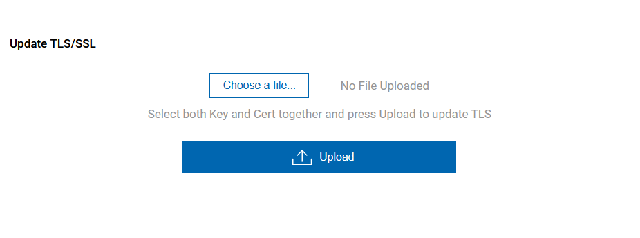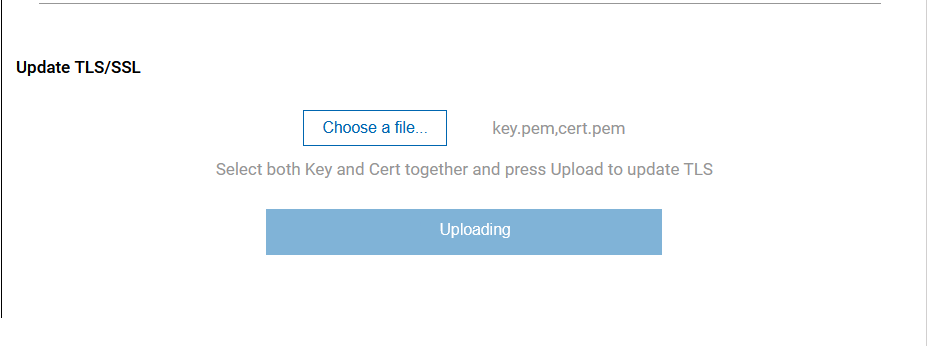 The TLS/SSL upload screen is shown as follows: Figure 6. TLS/SSL sert.pem and key.pem update