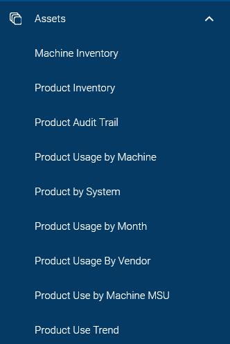 Assets Reports By clicking the Assets menu icon on the home page, you can expand and select a report from any of the available Asset reports. Figure 1. Assets Reports