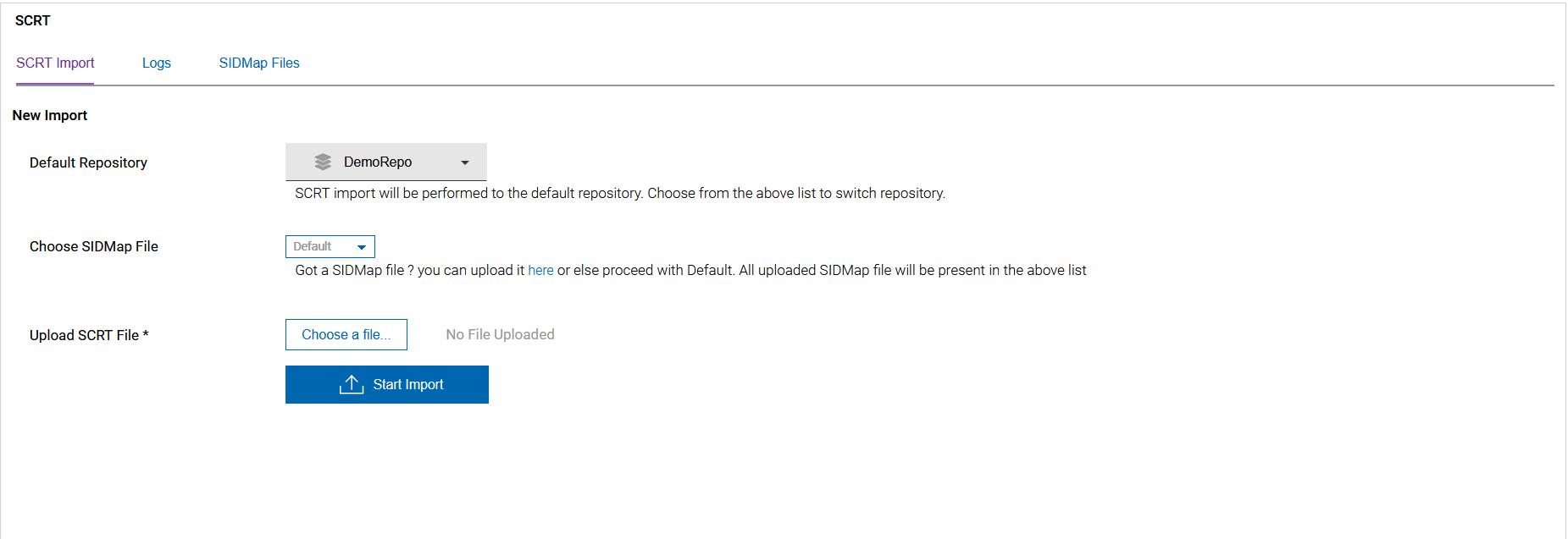 - To begin importing the uploaded SCRT file, click on the Start Import button.