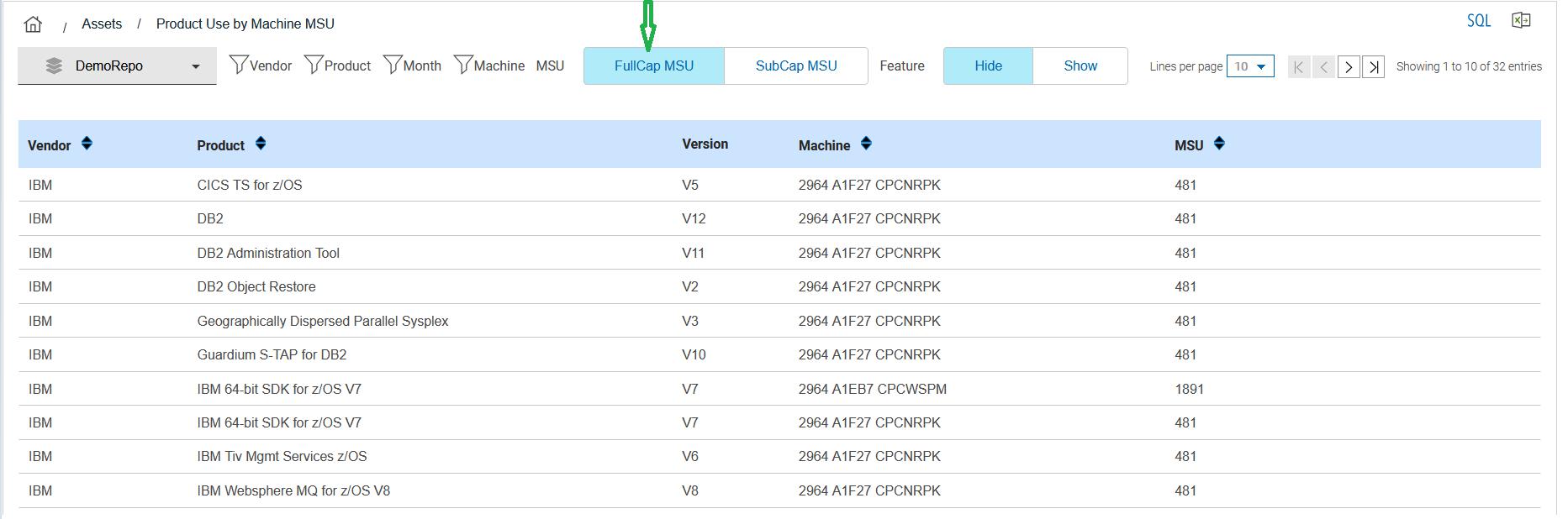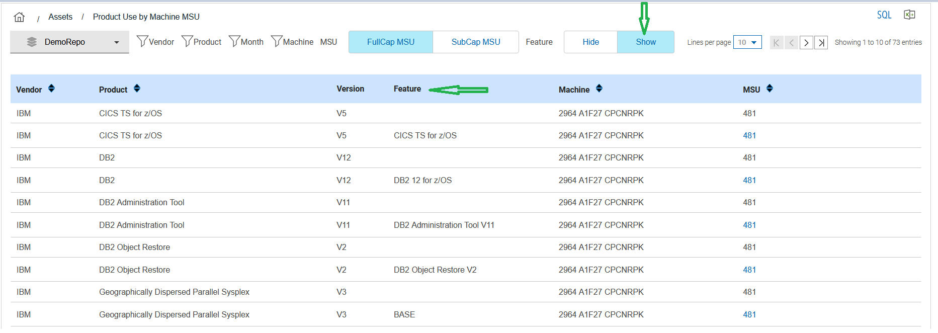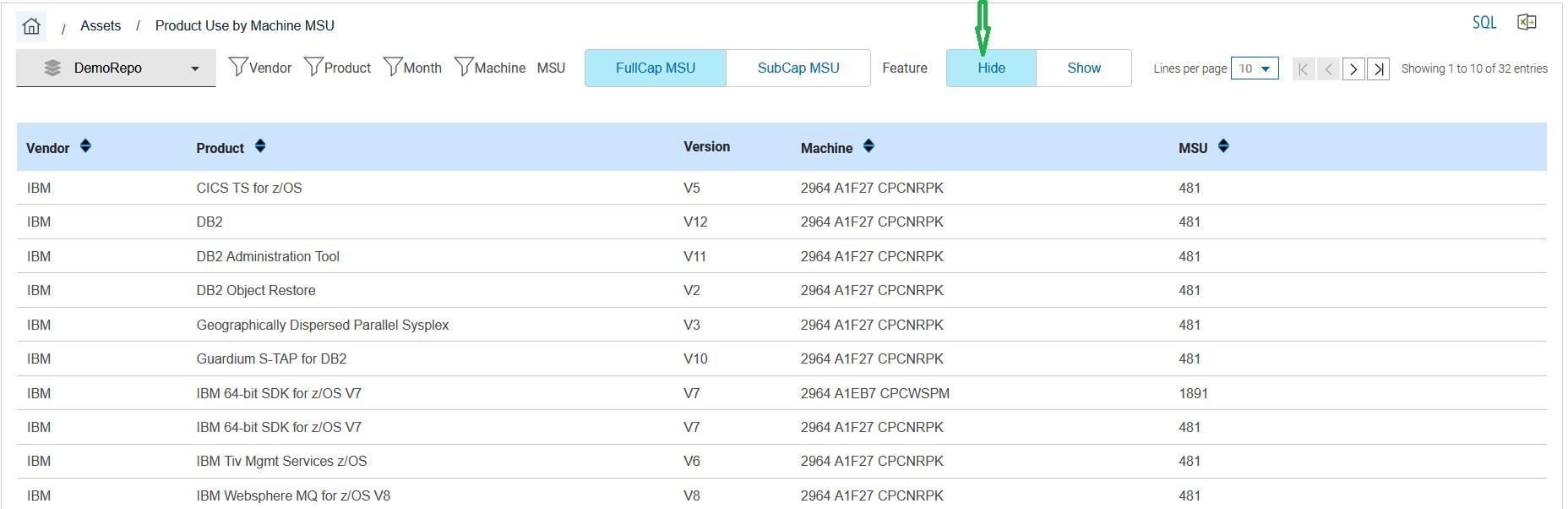 will change to Show Feature as shown here, and vice versa: Figure 2. Product MSU Report with feature column enabled