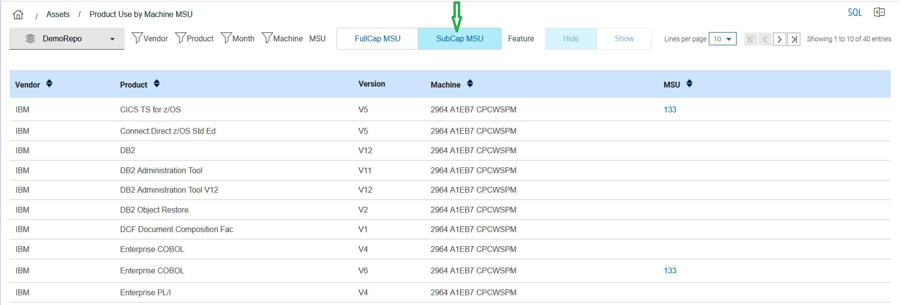 drop-down enables viewing the SubCap MSU report and the ‘Hide Feature’ toggle