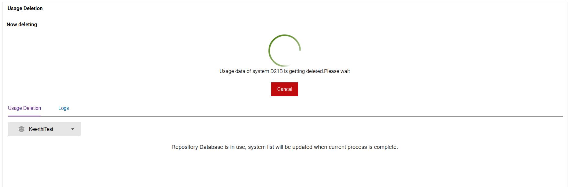 On clicking Save, the system usage deletion process starts, and the usage deletion processing screen appears.Figure 5. Usage Deletion processing