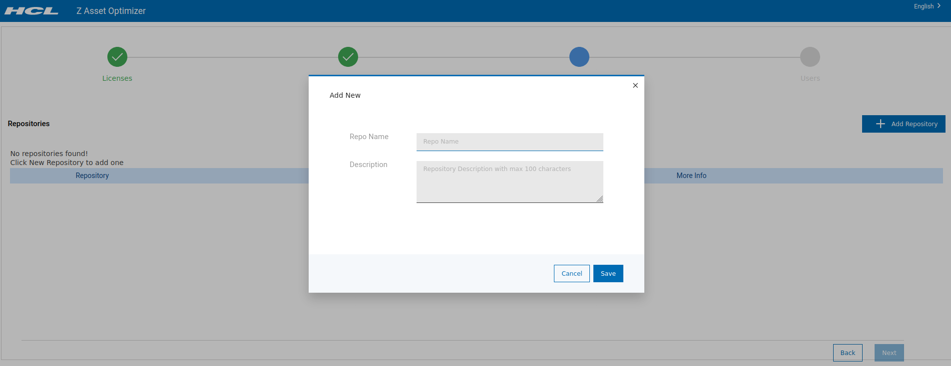 - Click on Add Repository button to create repository. Enter a repository name and then enter a useful description to describe the intended use for this specific repository, in the Description box provided.