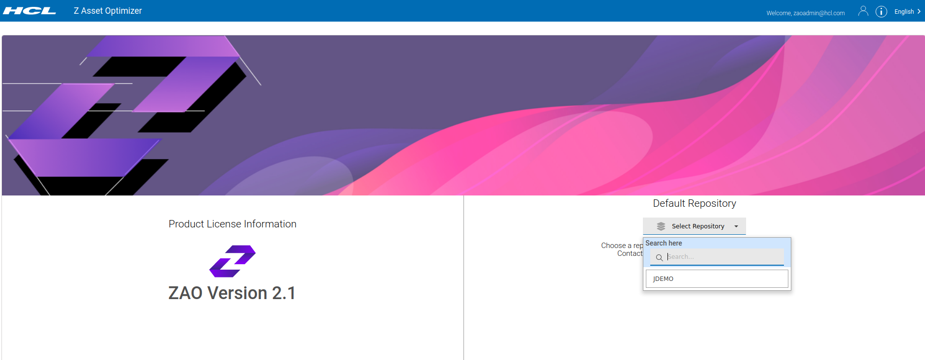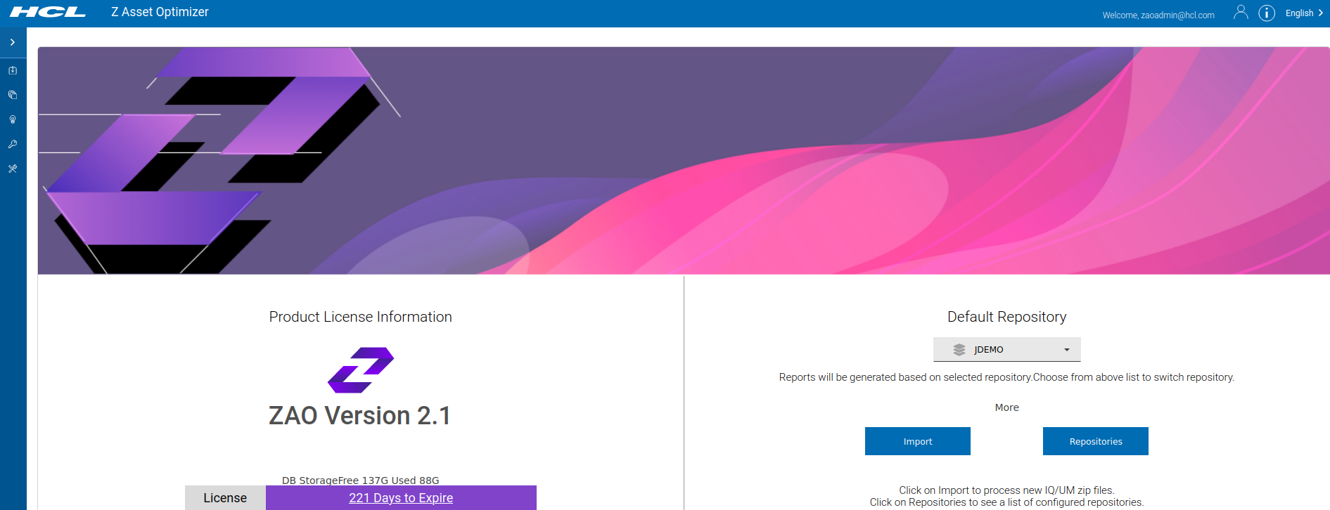 Figure 5. Users Page Once you add a new user or proceed from the “Users” page you are directed to the ZAO home page. Please select your initial default repository from the selection available as shown:Once selected, the home page will update to display your product license details and the available ZAO database disk space as demonstrated below.Figure 6. Initial install Home Page Repository Selection