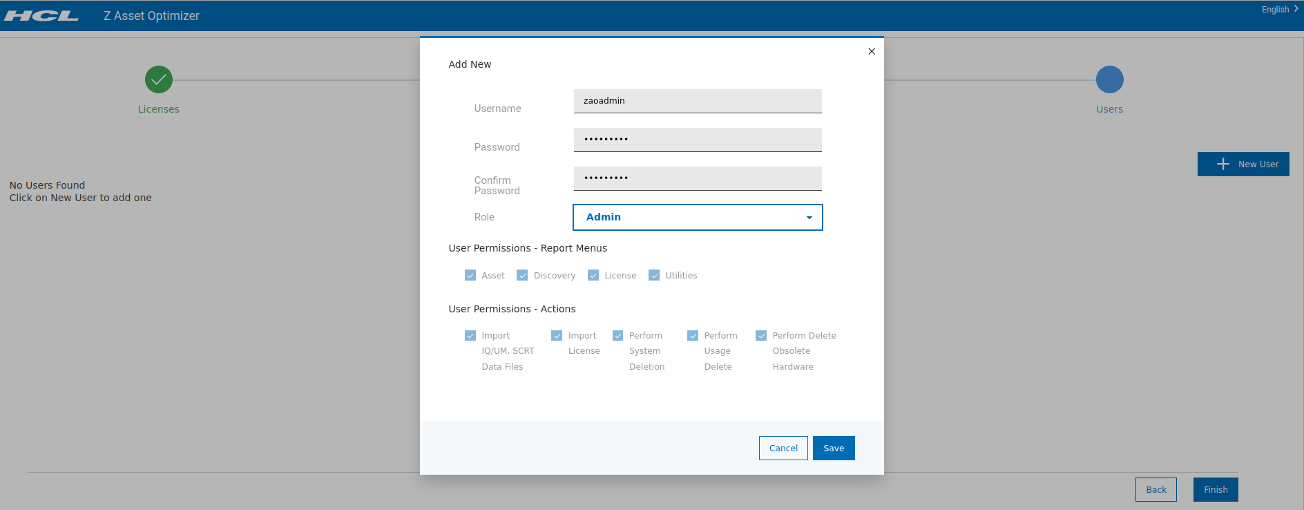 On the Users page, you can create more users, either Administrators,Auditors, or Users. It is recommended that you create at least one “Admin” user for later use, rather than using the supplied installation “admin” user once the install is complete. Please refer to the ZAO V2.1.1 Administration and Users Guide "User Administration" topic for details on creating new administrators, users, and the initial password rule requirements.