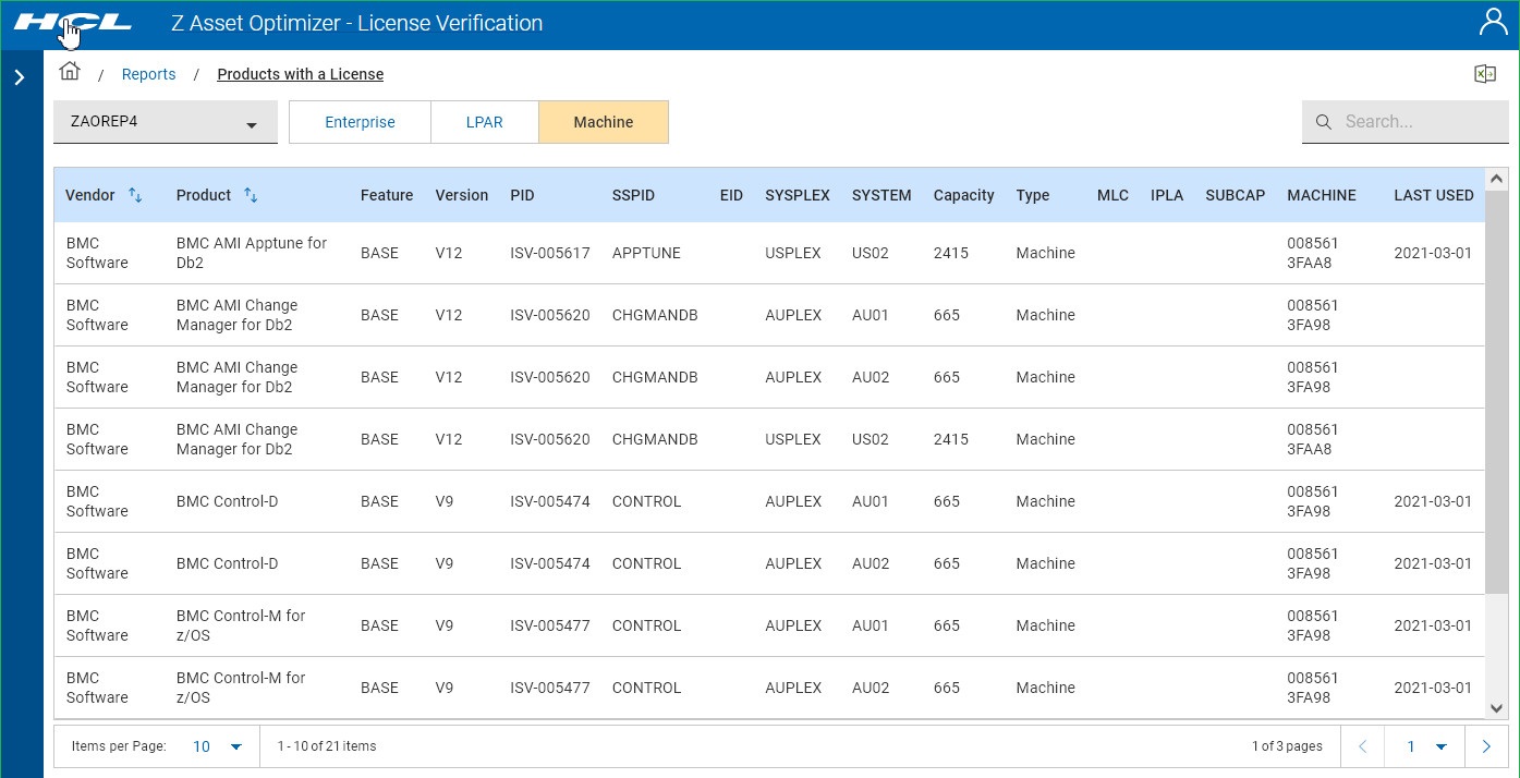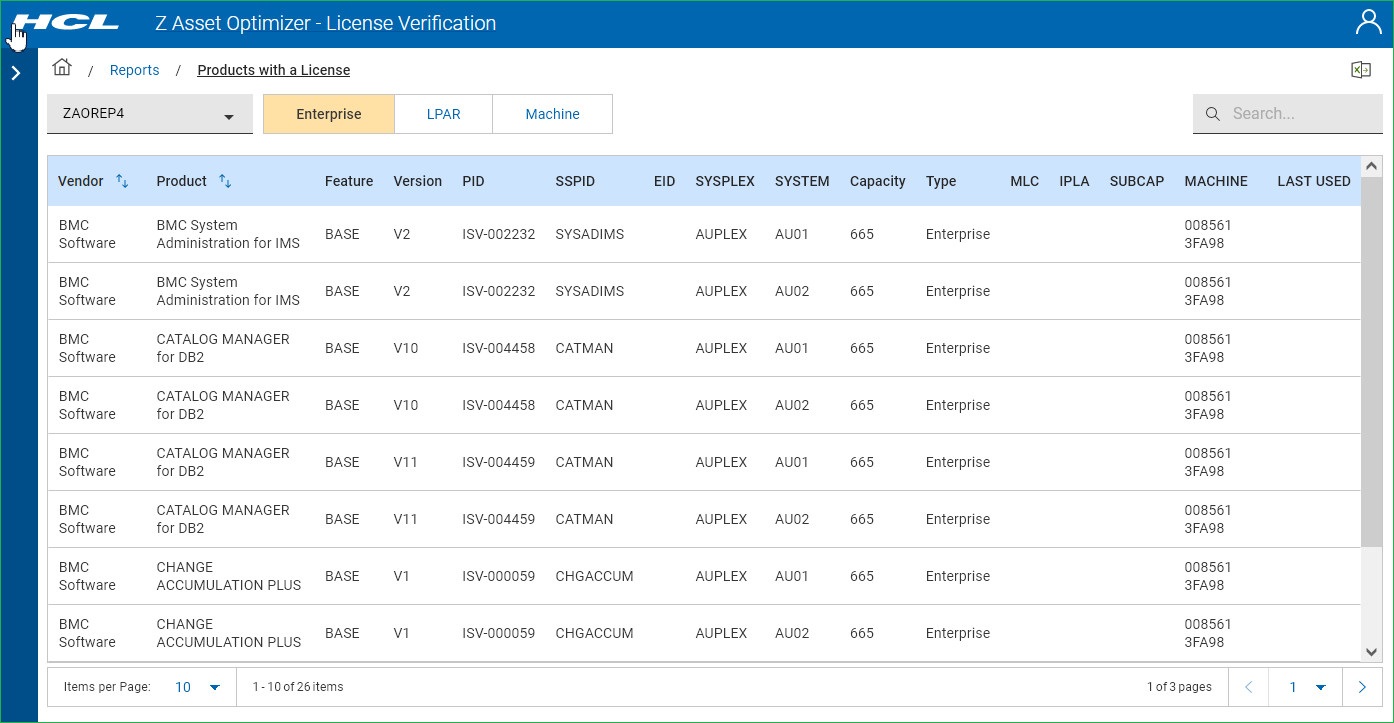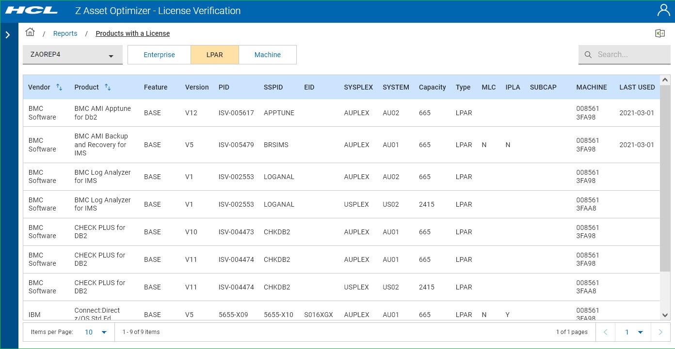 The report shows products that are LPAR licensed and on which machines the LPARs are on. You can Search for vendors or products using the Search facility. This is case sensitive.