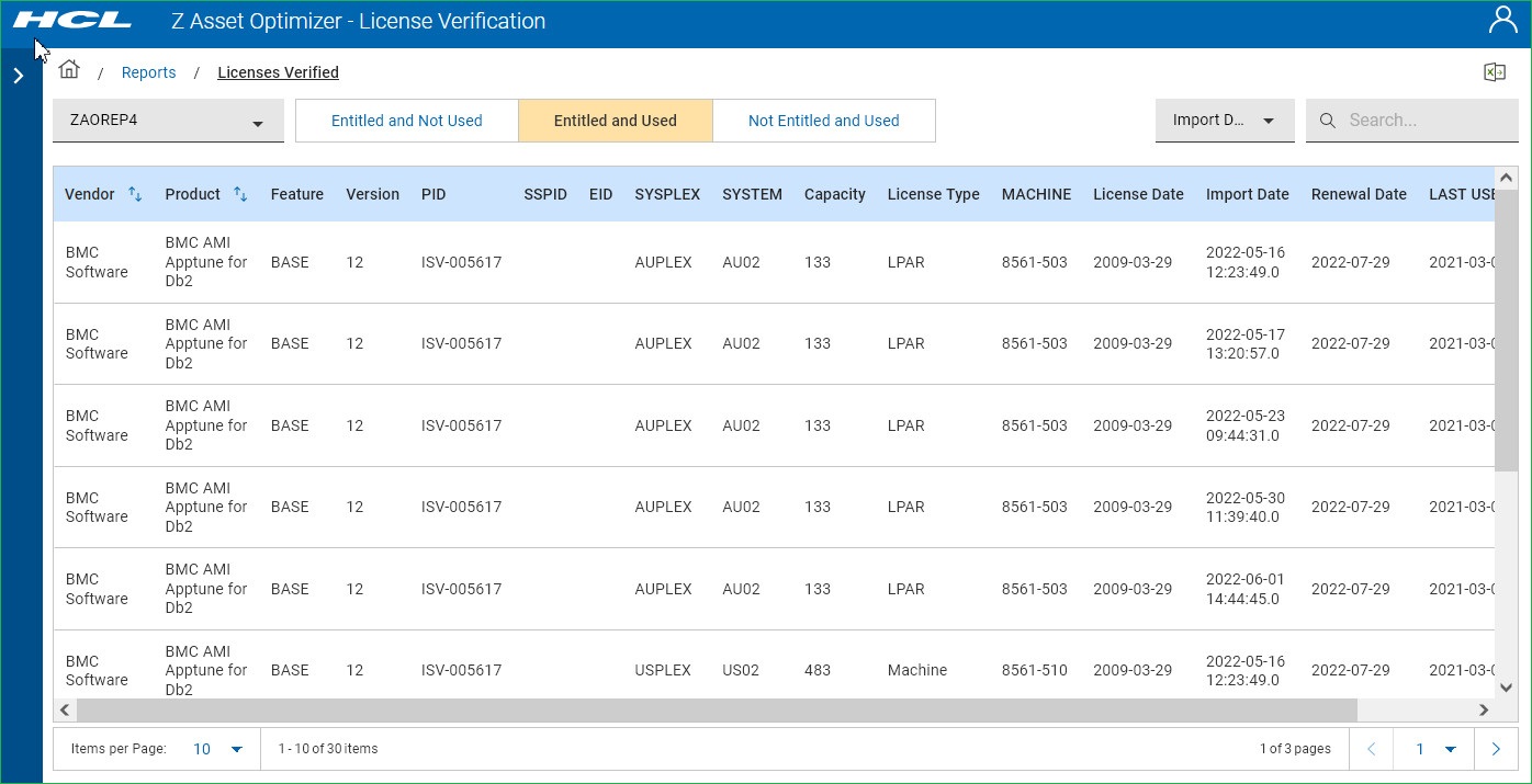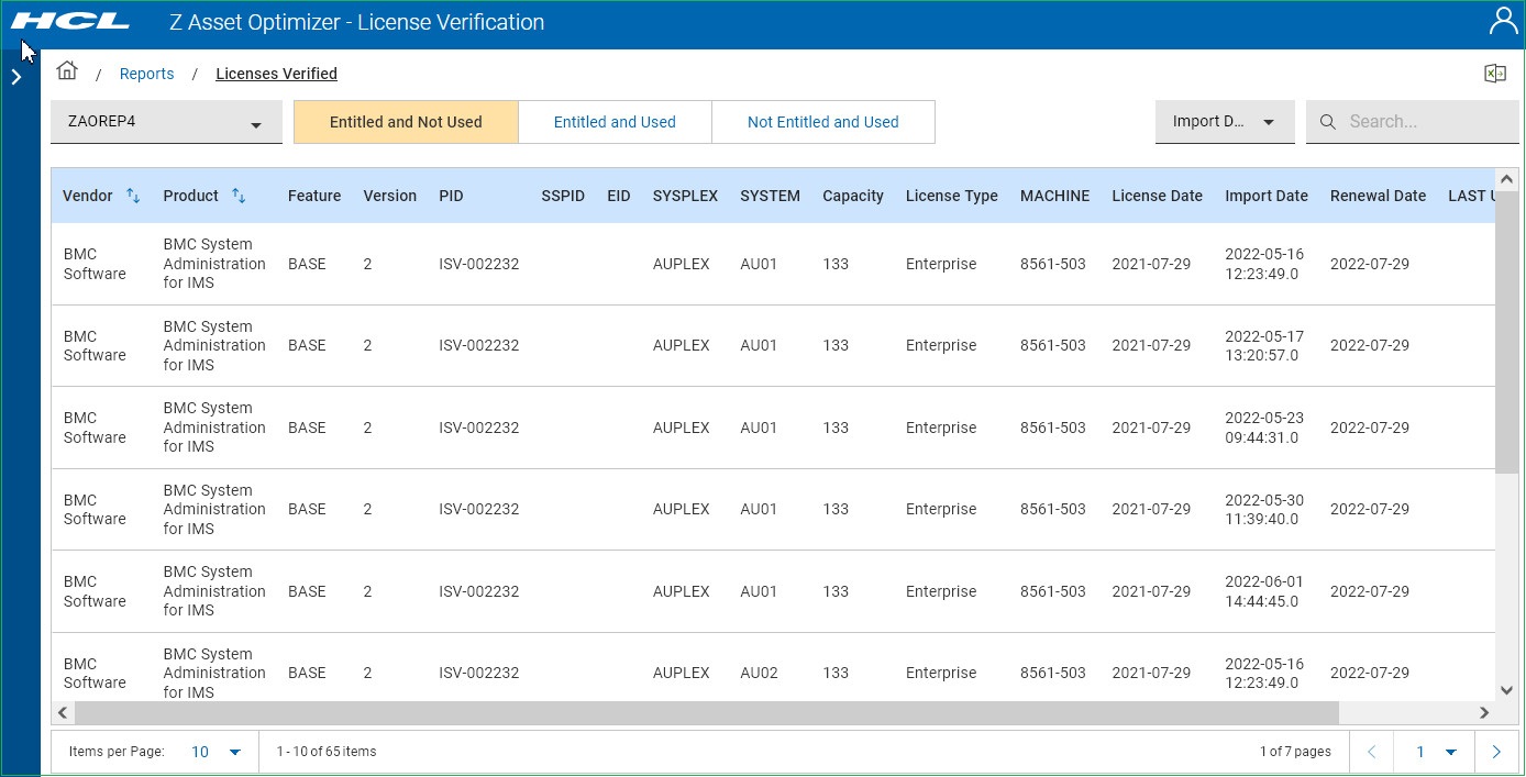 Each time you run the License Verification batch job, the previous loaded verification data are kept and new data are written to the LICENSE_VERIFY table. This allows you to view previously imported data. You can also compare different import dates.