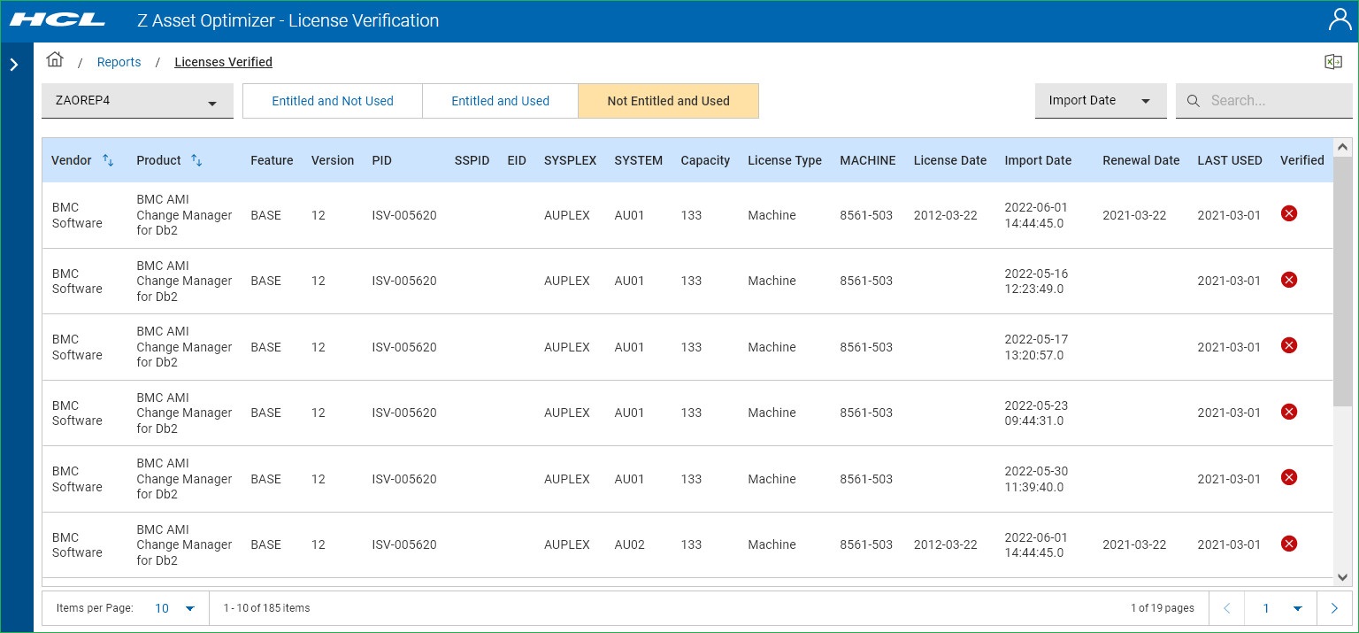 The Not Entitled and Used report shows licensed products that are still being used but have not met the verification criteria. Clicking on the red circle "x" under the Verified column displays the reason why the products have not been verified. One reason could be the capacity of the machine or LPAR has changed and does not match the license or the renewal date has passed.