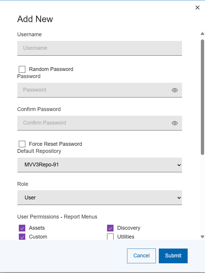 - For the User role, the Permissions section is enabled. Select the desired report access and repository database update actions for the user from the selections available.