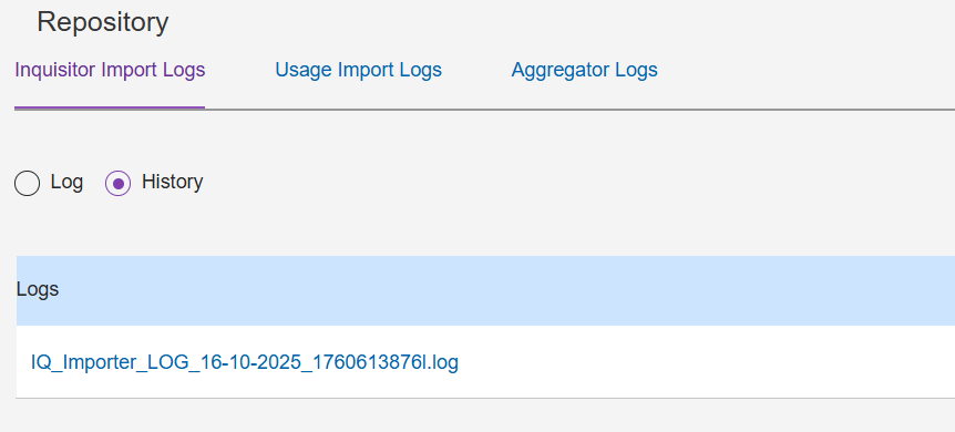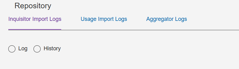 Note:When a successful import is complete, depending upon the kind of files you have uploaded, the respective log files will be displayed in the appropriate tabbed section.For instance, if you uploaded zip files related to Inquisitor, the log file name(s) are displayed in the (default) Inquisitor Import Logs tab. To view usage monitor or Aggregator log files, select the related tab to see the available log files as displayed: