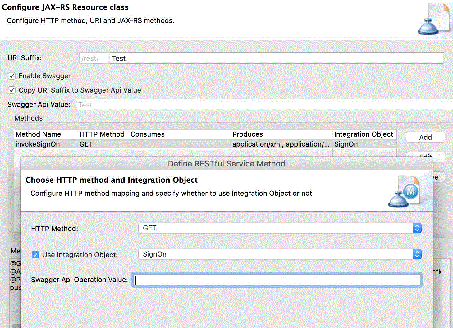 - On the Configure JAX-RS Resource Method page, defaults are set that reflect the HTTP method and Integration Object you selected. For more information about these method settings and how to customize them, see Customizing RESTful service JAX-RS resource methods. .