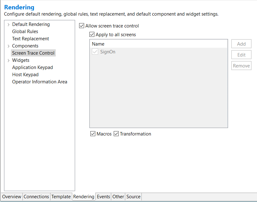 Users can use the Screen Trace Control option to control the printing of screen contents in the trace/log files, which occurs in certain incidents. For instance, during a macro failure, the application automatically logs the screen contents by dumping them into the message logs, and when the trace settings are enabled, the screen contents are also automatically dumped into the trace file.