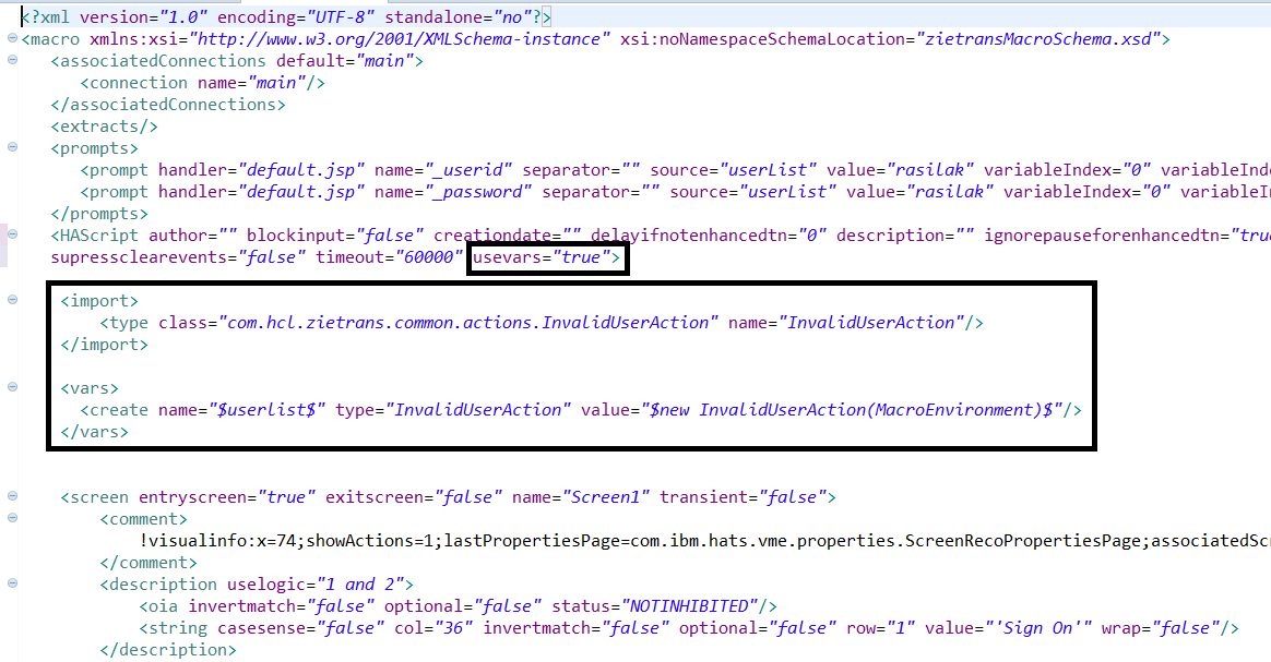 Example:<import> <type class="com.hcl.zietrans.common.actions.InvalidUserAction" name="InvalidUserAction"/> </import> <vars> <create name="$userlist$" type="InvalidUserAction" value="$new InvalidUserAction(MacroEnvironment)$"/> </vars>