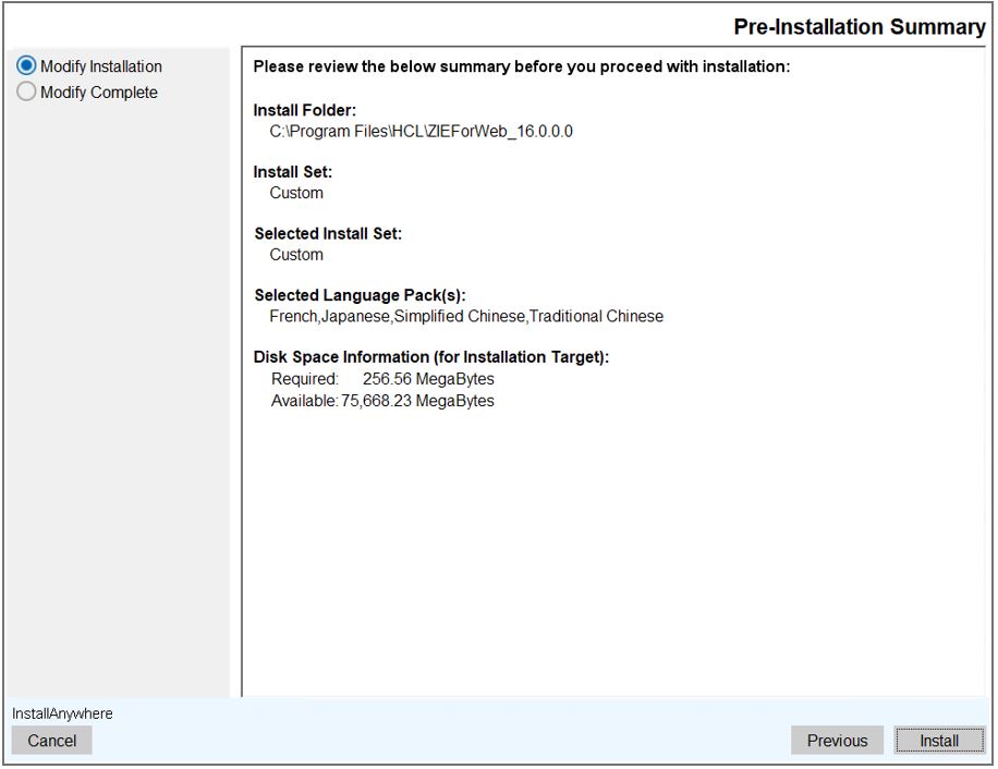 - Review the installation summary carefully and click Install.Note: To modify the options in the previous screen, click the Previous button.