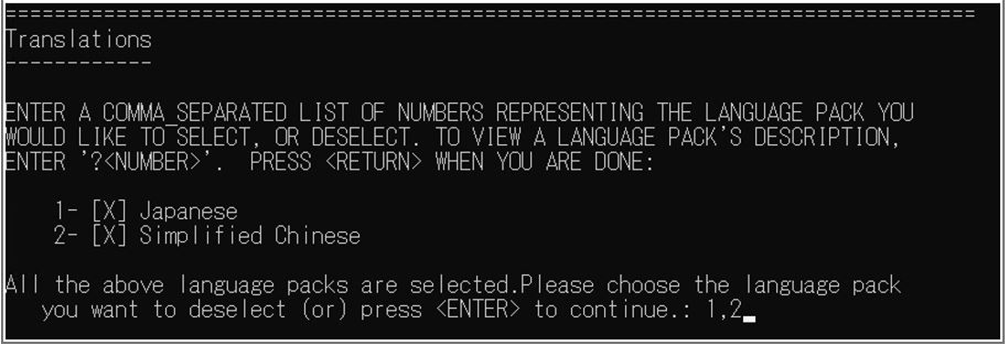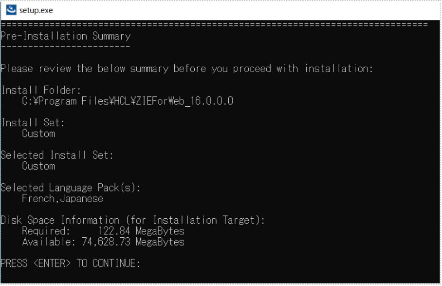 Note: To add multiple language packs, enter the numbers separated by comma(,). - The Pre-Installation Summary console appears.