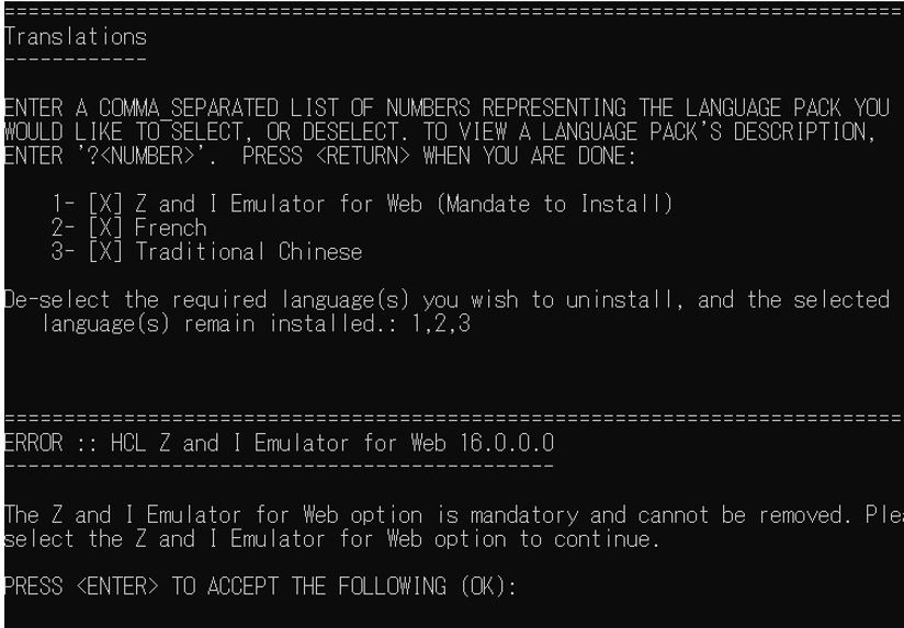 - The Z and I Emulator for Web option is mandatory. If you clear the Z and I Emulator for Web language pack option, an error message will appear, as shown below.