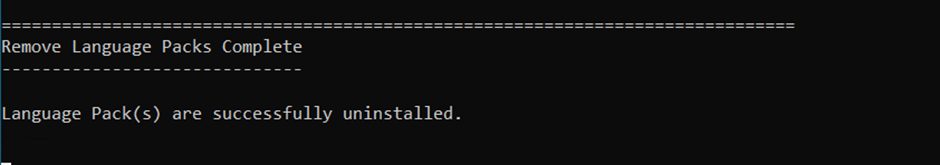 - After successful uninstallation of language packs, the Remove Language Packs Complete console appears.